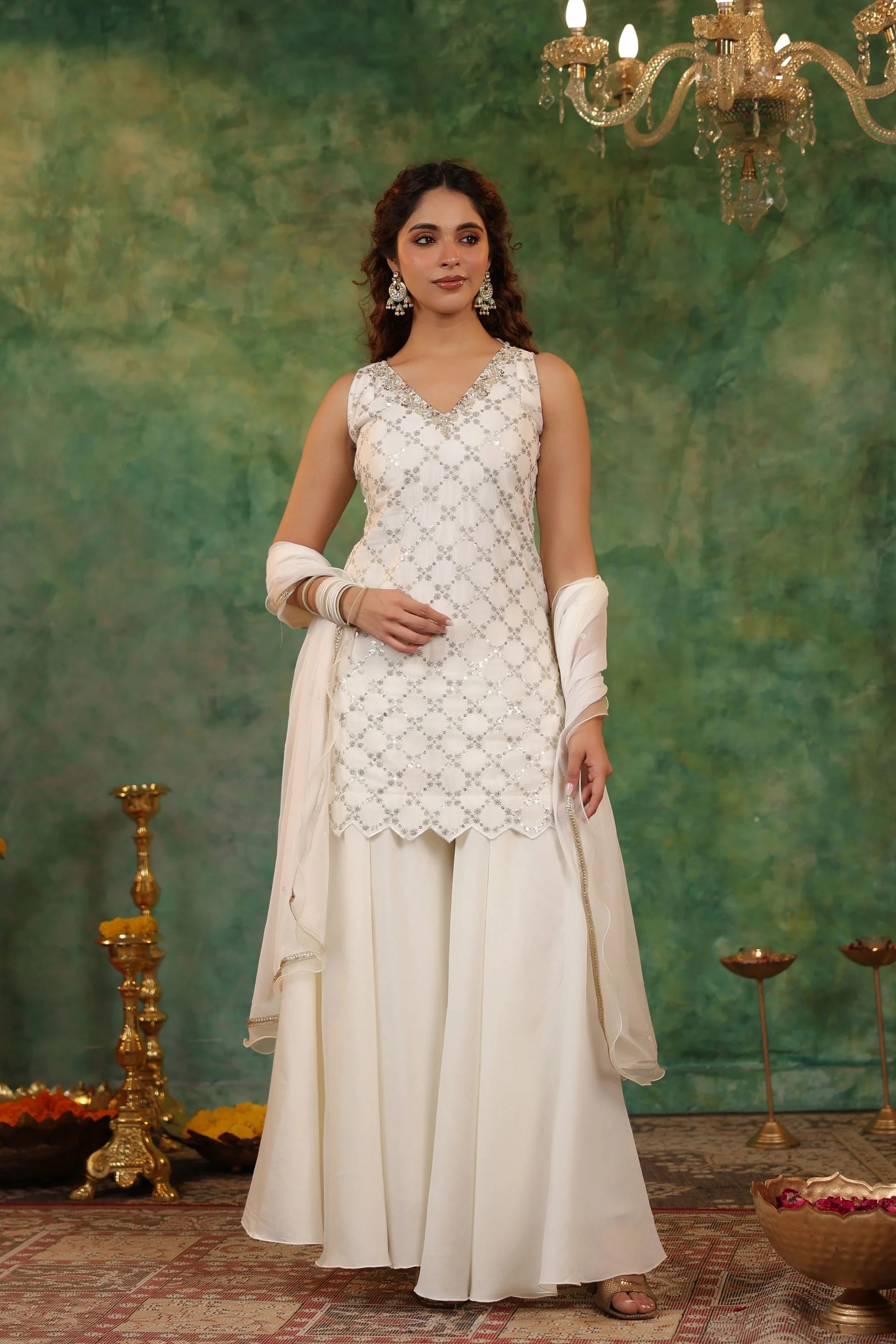 The serene ivory white color chosen for this garara set carries an understated charm that symbolizes purity, calmness, and elegance. Ivory has long been associated with classic luxury in traditional Indian wear, and this shade makes the outfit versatile enough to be styled for both day functions and evening celebrations. Its neutral tone provides the perfect canvas for intricate embroidery, fine detailing, and rich craftsmanship to shine through, while also allowing it to pair beautifully with accessories of various styles and colors.