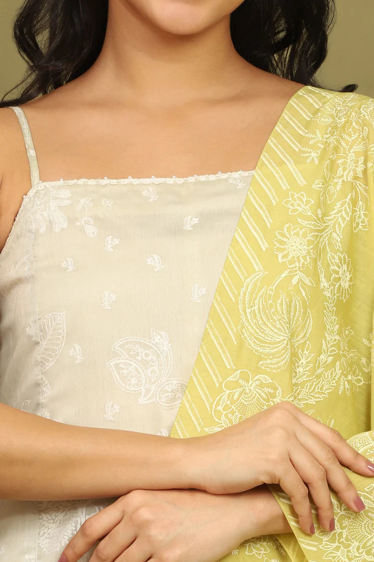 Elegant green floral printed Chanderi spaghetti strap straight kurta with pants and dupatta set is a refined and stylish choice for festive wear and special occasions. Designed with a perfect balance of traditional aesthetics and contemporary appeal, this ensemble highlights the timeless beauty of Chanderi fabric while incorporating modern cuts and detailing. The kurta features a straight silhouette that creates a sleek and elongated look, making it flattering for a variety of body types. Its delicate spaghetti straps add a youthful and contemporary touch, while the overall design maintains the elegance of ethnic wear. The refreshing green base color is beautifully enhanced with floral prints that exude vibrancy and charm, creating a lively yet graceful appearance.