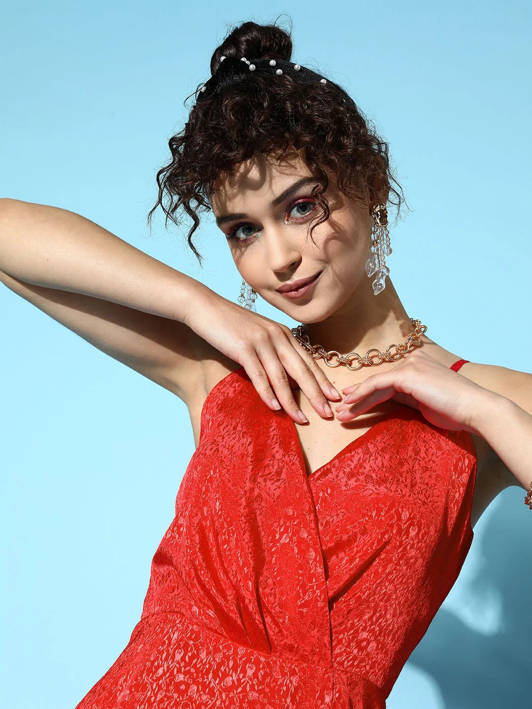 Red Floral Printed V-Neck Maxi Dress, designed to bring a bold and feminine touch to your wardrobe. Made from smooth and lightweight crepe fabric, it offers a graceful drape and a comfortable fit, perfect for both daytime events and evening occasions. The vibrant red base is beautifully adorned with delicate floral prints, adding a romantic and eye-catching charm.